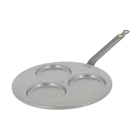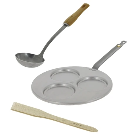 – Une poêle en tôle de fer blanc de la gamme Mineral B finition à la cire d’abeille et queue en acier feuillard, permettant de réaliser 3 blinis de 10 cm de diamètre.