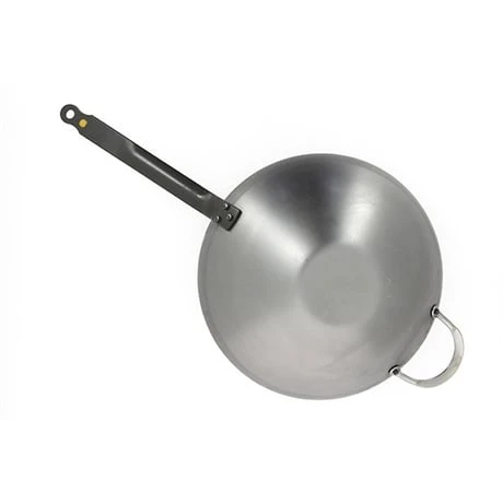 Equipé d’une queue feuillard courbée à la française, le wok De Buyer vous offrira une bonne maniabilité et pourra être rangé sur un crochet grâce au trou situé à l’extrémité du manche. Cette poignée est rivetée pour un résultat indémanchable, ce qui offrira une grande longévité au wok, combiné à sa jupe épaisse indéformable. Et pour bien supporter ce récipient volumineux, une anse est également placée à l’opposé de la queue.