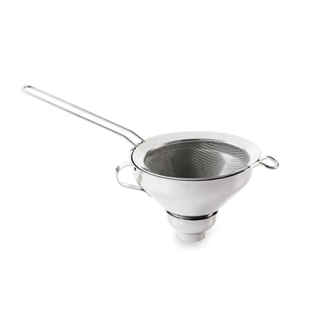L’ensemble passoire et entonnoir permet de remplir proprement un siphon sans laisser passer de résidus, et de garnir pots, verrines…