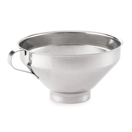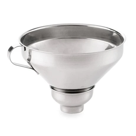 L’entonnoir s’utilise sans embout (pour un diamètre de 5,5 cm) ou avec un embout amovible en inox (fourni avec) pour s’adapter aux plus petits pots et plus spécifiquement aux siphons. La passoire s’adapte parfaitement sur l’entonnoir. En inox, la passoire et l’entonnoir passent au lave-vaisselle.