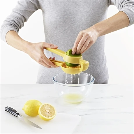 Le presse-agrumes JuiceMax Joseph Joseph est conçu à double action de pressage pour obtenir jusqu’à la dernière goutte. L’ustensile JuiceMax Joseph Joseph est idéal pour différents types d’agrumes : citrons, citrons verts, petites oranges ou mandarines. Les deux poignées à pression facile sont idéales pour presser en toute simplicité. Sa partie supérieure rotative, elle, est parfaite pour aléser et finir tout le citron. Sa forme intercepte les pépins et la pulpe pour ne laisser passer que le jus précieux du citron. Le presse-agrumes à double action Joseph Joseph est facile à nettoyer et à ranger.