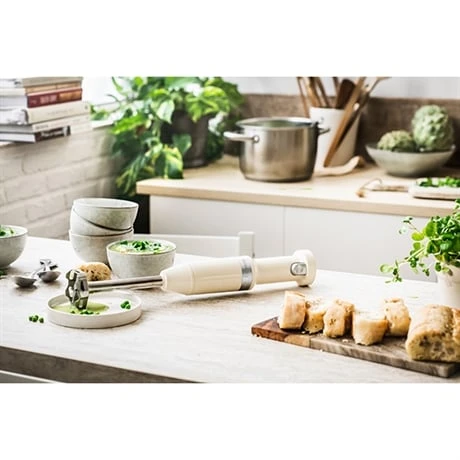 Avec l’élégant mixeur plongeant sans fil 5KHBBV53 Kitchenaid couleur crème, réalisez des préparations légères et onctueuses sans difficulté. Cet appareil de petit électroménager polyvalent est pratique car son format compact vous permet de le ranger facilement sans encombrer vos placards. Sans fil, ce mixeur rechargeable vous offre une liberté de mouvement appréciable en cuisine.