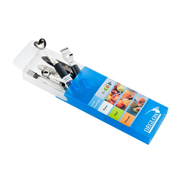 | Composition | 1 cuillère à pomme diamètre 22 mm -1 cuillère d’amour – 1 vide pomme diamètre 15 mm PM – 1 décozest droitier – 1 éplucheur – 1 décofruit « V » 8 cm |