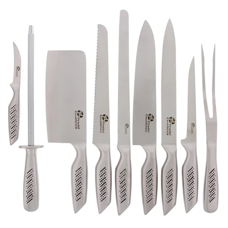 Découvrez le set de 9 pièces de découpe de qualité professionnel doté d’un sac de rangement en toile, le kit complet pour cuisiner et aiguiser au quotidien. Avec ce set vous disposez de tous les ustensiles nécessaires pour une cuisine pratique ! Fabriquées en acier inoxydable d’un seul bloc, ces pièces de découpes sont ultra robustes et seront résistantes dans le temps. Ce set comporte :